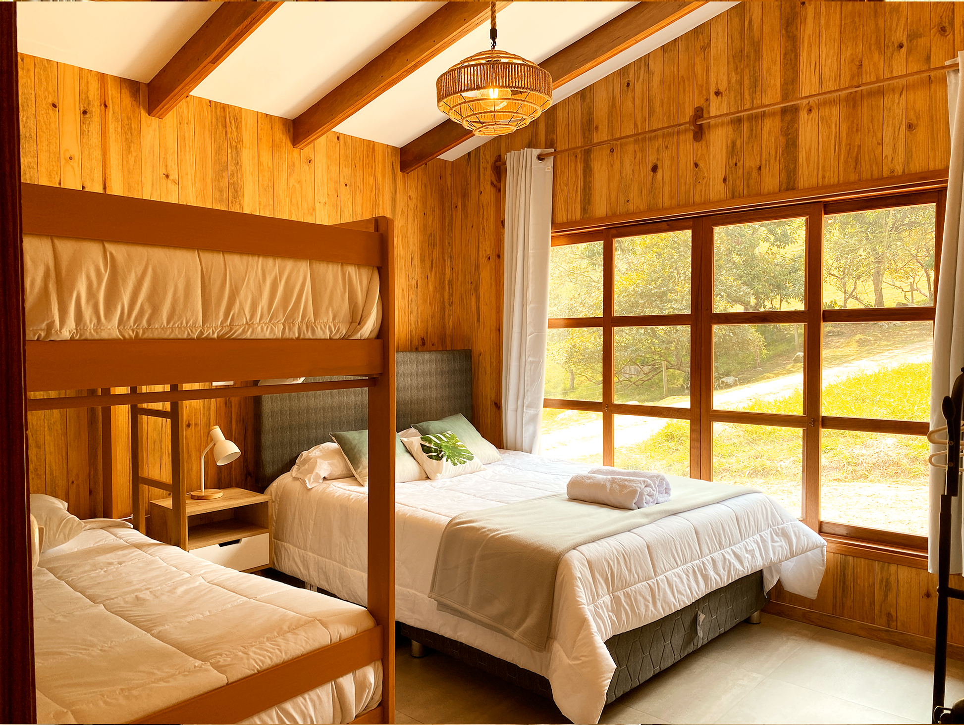 - Confort: 2 habitaciones ( 1 matrimonial con cama queen y la otra familiar con cama queen y camarote) cada una diseñada para un descanso reparador, y 2 baños completos para mayor comodidad.